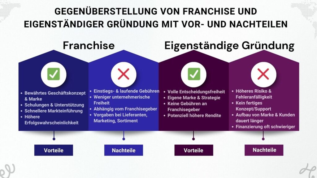 Um die Entscheidung zwischen einem Franchise-System und einer eigenständigen Gründung zu erleichtern, haben wir die wichtigsten Aspekte beider Modelle gegenübergestellt:
