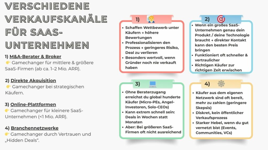 Die Wahl des richtigen Verkaufskanals kann den Unterschied zwischen einem durchschnittlichen und einem herausragenden Exit ausmachen. Jeder Kanal hat spezifische Vor- und Nachteile:
