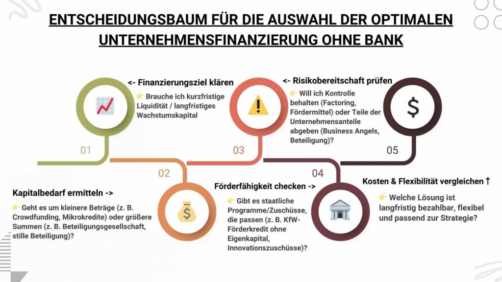 Um die optimale Form der Unternehmensfinanzierung ohne Bank zu finden, sollten verschiedene Faktoren berücksichtigt werden. Die folgende Übersicht hilft bei der Entscheidungsfindung: