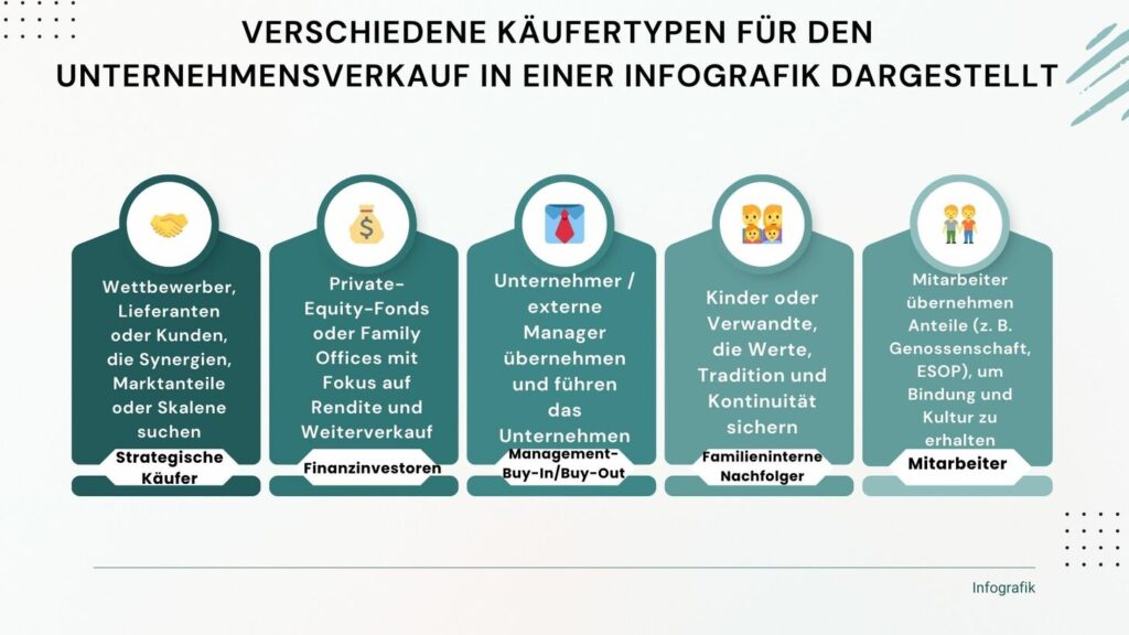 | Strategische Käufer | Marktanteile gewinnen, Synergien nutzen | Hoch | Oft Wettbewerber oder Unternehmen aus angrenzenden Branchen |