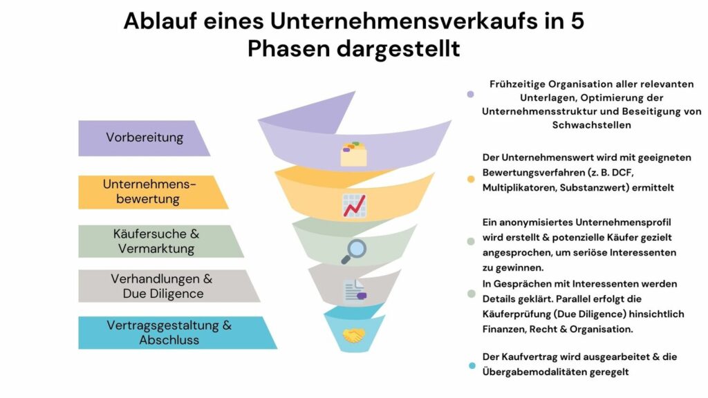Um die genannten Fehler zu vermeiden, ist es wichtig, den Verkaufsprozess strukturiert anzugehen. Ein professionell geführter Unternehmensverkauf umfasst typischerweise folgende Phasen: